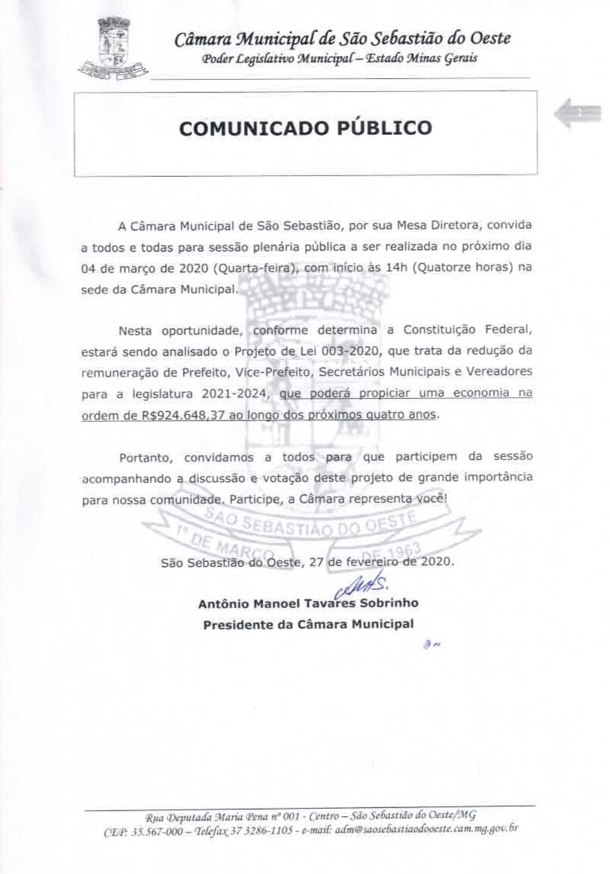 A Câmara Municipal de São Sebastiao do Oeste, por sua Mesa Diretora, convida a todos e todas para sessão plenária pública a ser realizada no próximo dia 04 de março de 2020 (Quarta-feira), com início as 14h (Quatorze horas) na sede da Câmara Municipal.