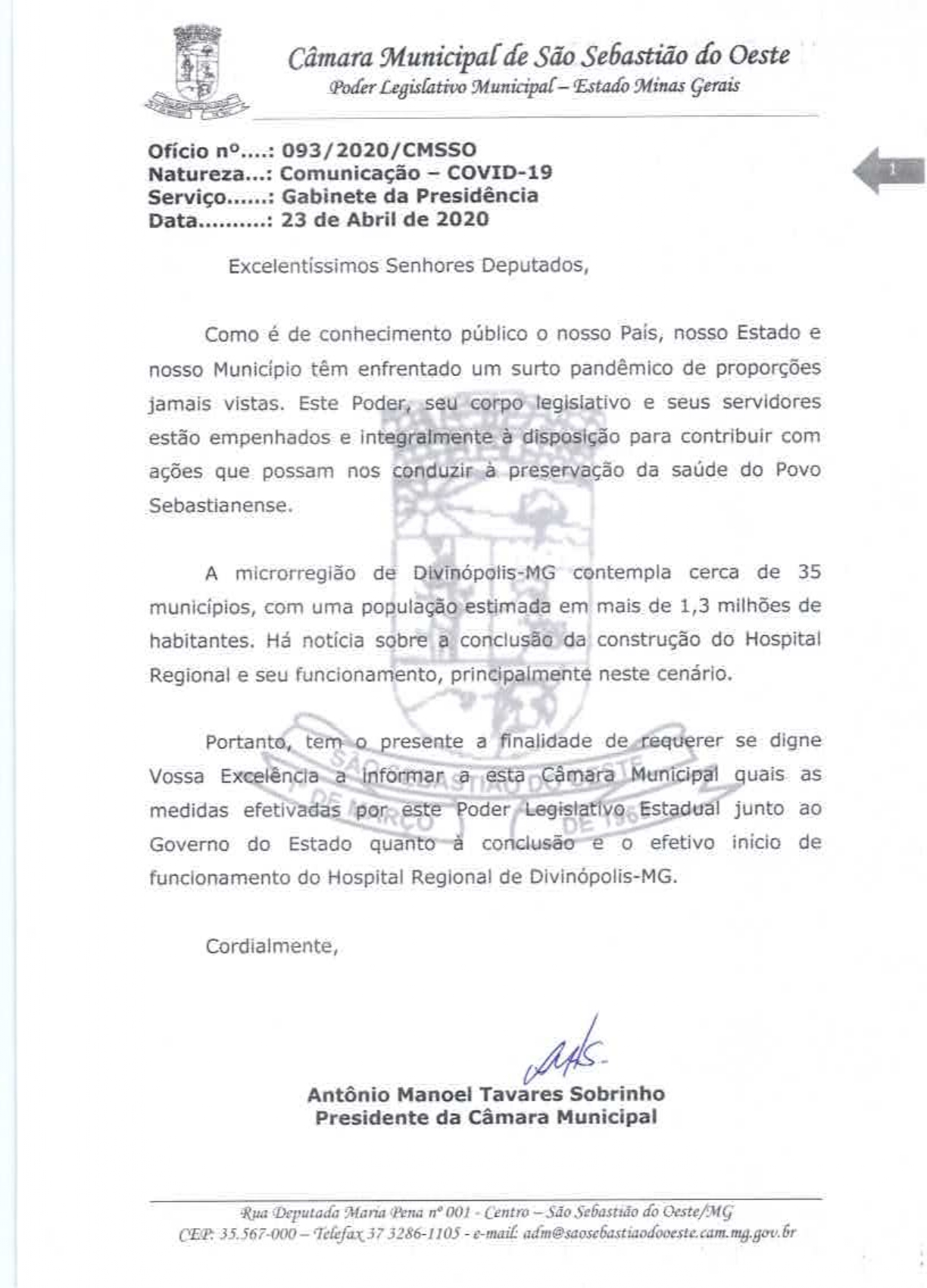 Ofício nº: 093/2020/CMSSO -- Natureza: Comunicação COVID-19 -- Serviço: Gabinete da Presidência -- Data: 23 de Abril de 2020